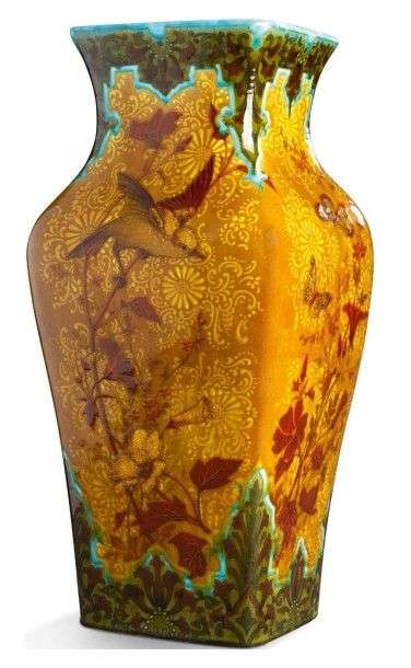 Grand vase de forme balustre à pans coupés et col resserré quadrangulaire en céramique émaillée polychrome et rehaut d'or à décor de motifs floraux, d'oiseaux et de papillons en vol sur fond ocre.