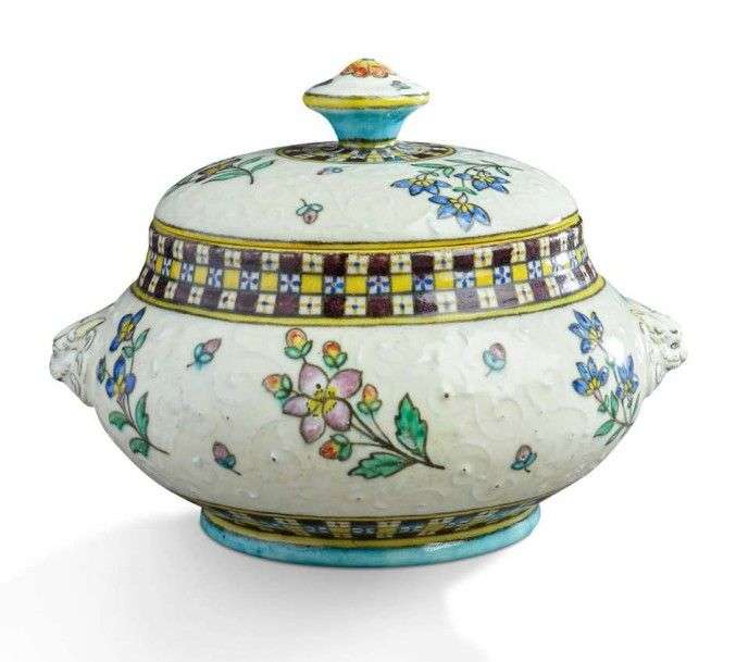 Bonbonnière couuverte en céramique émaillée polychrome de motifs florauux sur fond blanc crême flanqué de deux mufles de lion.