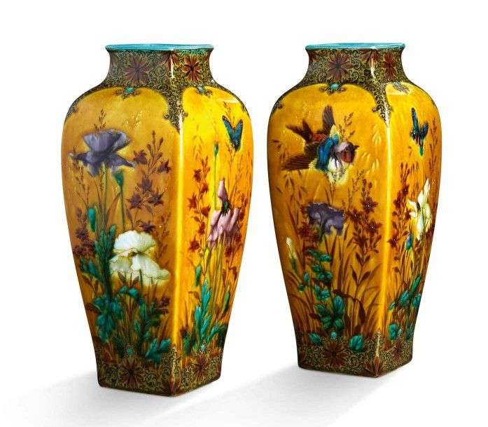 Paire de vases de forme balustre à pans coupés et col resserré quadrangulaire en céramique émaillée à décor de motifs floraux, d'oiseaux et de papillons en vol en polychromie sur fond ocre.