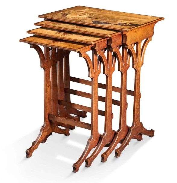 Suite de quatre tables gigognes en noyer à plateau marqueté en bois exotiques de volatiles en vol et de scènes marines bretonnes.