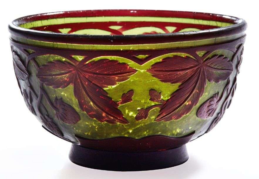 Rare coupe sur talon circulaire en verre doublé à décor dégagé à l'acide de fraises rouges partiellement repris à la roue sur fond vert martelé à l'intérieur craquelé.