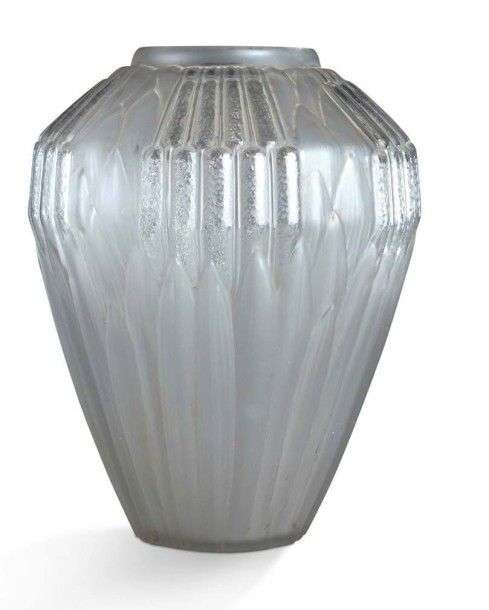Vase en verre moulé pressé en verre satiné et opaque à décor en relief de motifss feuillagés stylisés.