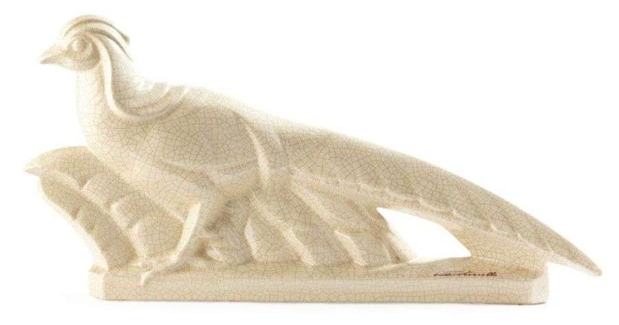 Epreuve zoomorphe en céramique craquelée blanche représentant un faisan