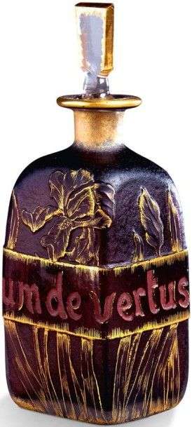 Flacon et son bouchon en verre teinté mauve à décor dégagé à l'acide de motifs floraux rehaussés d'or et d'une inscription en creux "Parfum de vertus".