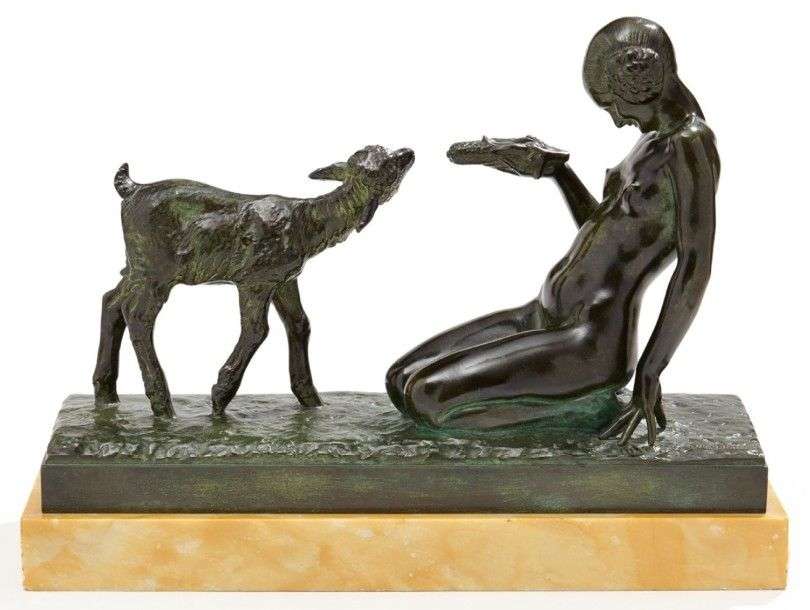 Epreuve en bronze à patine verte figurant une jeune femme agenouillée à l'épis de maïs et à la chèvre, reposant sur une base rectangulaire en marbre jaune