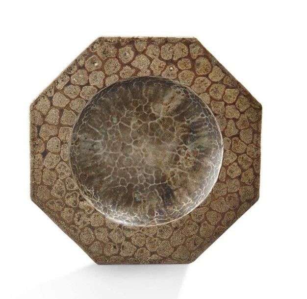 Petite assiette octogonale en dinanderie de cuivre martelé à patinenoir et argenté à motifs géométriques/