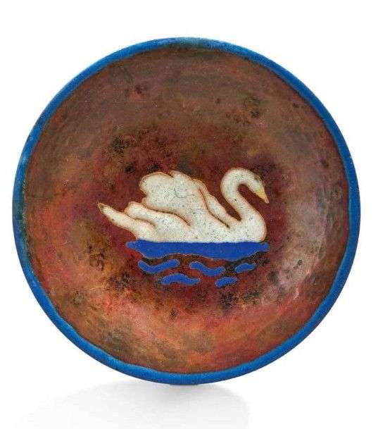 Coupelle en dinanderie de cuivre martelée et patinée rouge à décor émaillé d'un cygne.
