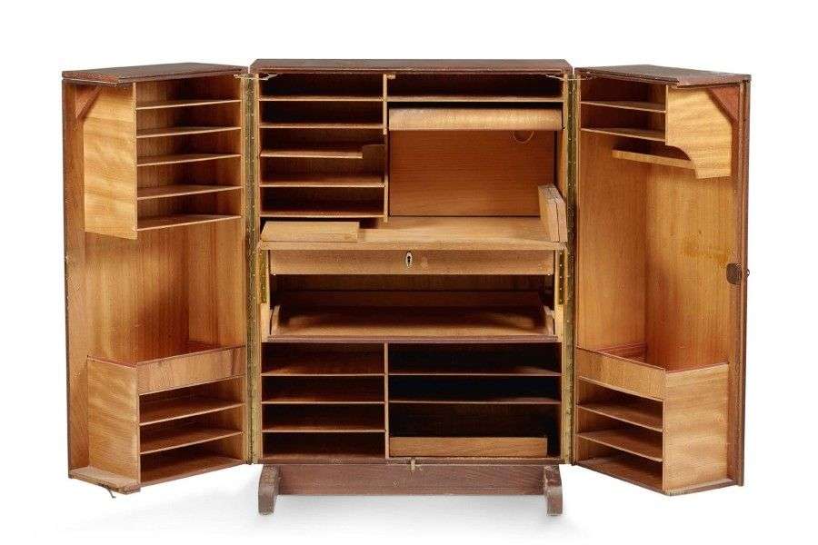 Bureau formant une bibliothèque ouvrant par deux portes dans sa partie centrale, intérieur éclairant à casiers, plateau à rabat (quelques tâches au placage)