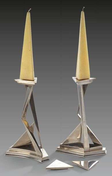 Paire de bougeoirs en métal argenté de forme libre.