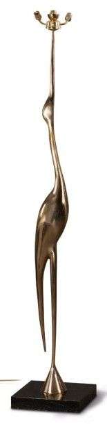 Lampadaire en bronze doré figurant un héron stylisé et reposant sur une base carrée en altuglas fumé mauve.