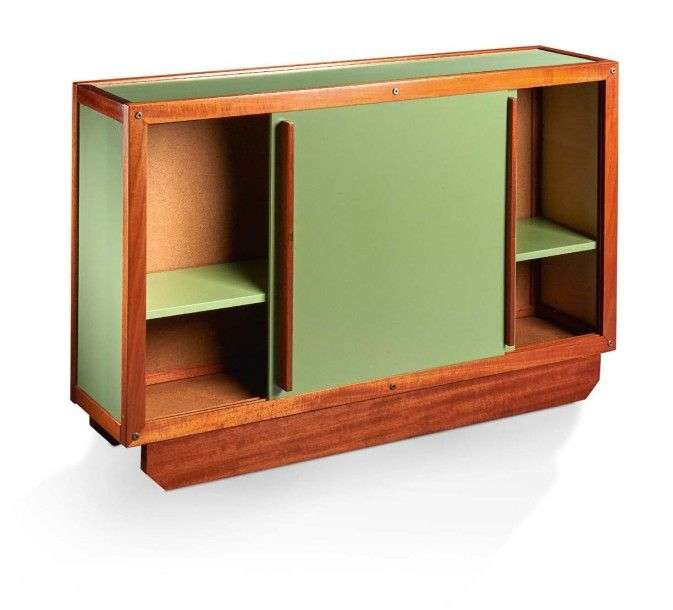 Buffet en bois exotique et bois laqué vert ouvrant par deux portes coulissantes découvrant un intérieur compartimenté.