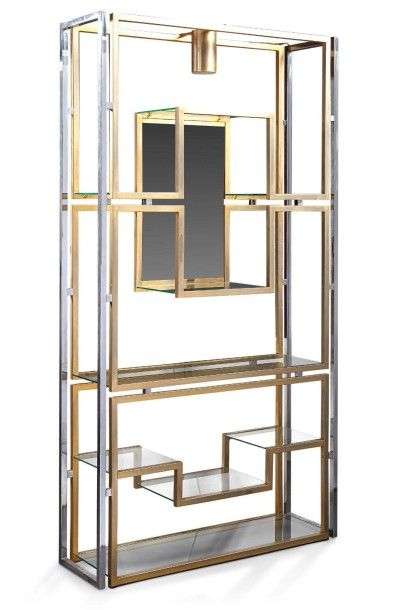 Bibliothèque éclairante à structure en aluminium doré et chromé, présentant des étagères en verre superposées et enserrant un verre opalin noir au centre de la niche formant miroir.