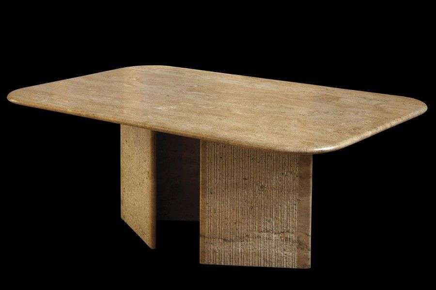 Table de salle à manger en marbre présentant un plateau rectangulaire à bords arrondis reposant sur deux montants formant des "V" inversés à surface burinée.