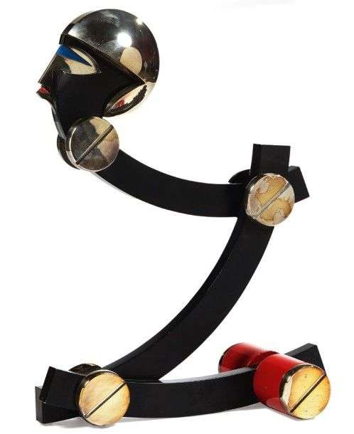 Sculpture antropomorphe composé de trois arcs métalliques de section rectangulaire, laqués noirs forment un grand Z et se terminant à la partie supérieure par le visage d'une femme casquée.