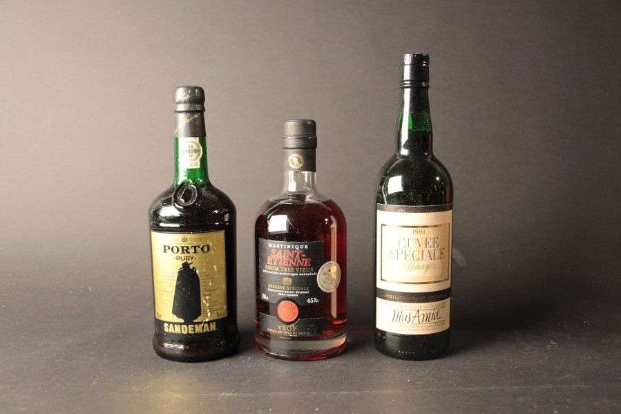 1 B MAURY CUVEE SPECIALE Mas Amiel 1981 1 B PORTO RUBY Sandeman NM 1 B RHUM TRES VIEUX RESERVE SPECIALE VSOP Saint Etienne NM