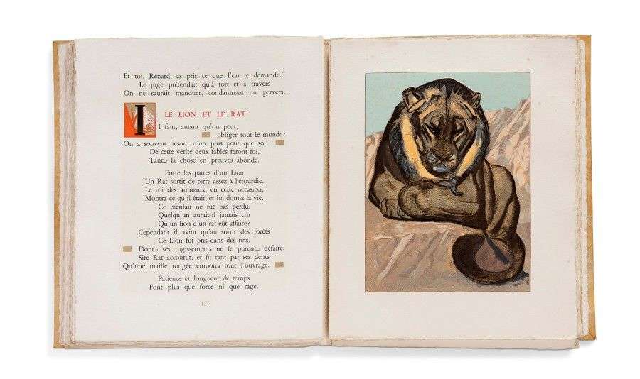 LA FONTAINE (Jean de) Fables. Illustrées par Paul Jouve. S.l. [Lauzanne], Gonin et Cie, 1929. In-4, en ff, couverture illustrée rempliée, chemise vélin à lacets et étui. Tirage à 150 exemplaires illustré de 33 compositions originales de Paul Jouve dont 13 hors texte, certaines réhaussées à l'or, ornementation établie par François-Louis Schmied. Légères piqures.