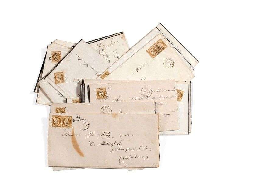 - Émissions anciennes 22 Lettres affranchies n°1, 10c. bistre-jaune, Cérès nd. Nombreuses paires. Certaines avec timbres défectueux. Nuances. Oblitérations de localités diverses.