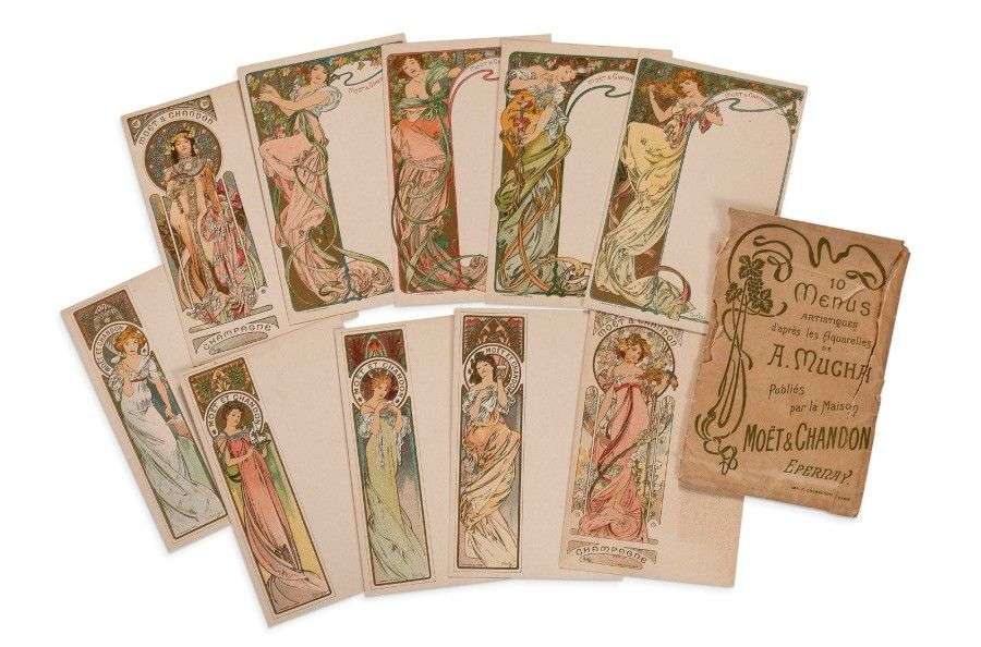 MENUS ILLUSTRÉS - Alfons MUCHA. 10 Menus, format carte postale, présentant en bandeau latéral gauche des illustrations Art Nouveau. Quelques brunissures sur certains menus. Pochette partielle, déchirée.