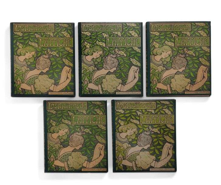 Les Maîtres de l'affiche" - Publication mensuelle contenant la reproduction en couleur des plus belles affiches illustrées de la fin du XIXe siècle. Paris: Chaix, 1896-1900, 5 volumes in-folio. 240 pl. en chromolithographie, correspondant à 60 livraisons, par Toulouse-Lautrec, Bonnard, Grasset, Mucha, Steinlen, M. Denis, de Feure, etc. Contient également 16 lith. offertes en prime. Reliures éditeur d'époque. Bel état de conservation. Légères brunissures sur les premières pages de garde et accidents aux charnières intérieures sur deux volumes.