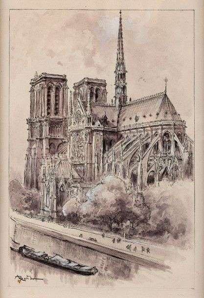- Notre-Dame de Paris. Dessin à l'encre de chine noire, lavis d'encre de chine et rehauts de blanc, signé, 19 x 13 cm. Encadré. - Joint, 2 dessins à l'encre l'un représentant une église, l'autre une fontaine| 3 programmes imprimés Musique du 87e territorial| 2 petites pointes sèches concernant Robida: faire part de naissance de son fils et annonce de son changement d'adresse au Vésinet.