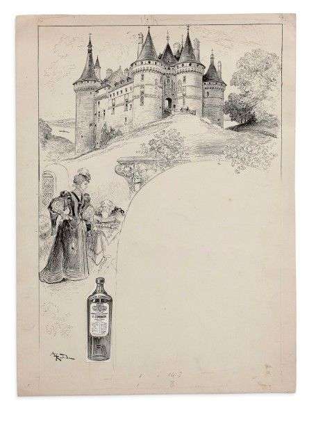 - Projet de menu. Dessin à l'encre de chine, représentant le château de Chaumont-sur-Loire et des personnages historiques. Publicité pour l'Élixir Combier, 34,3 x 25,5 cm.