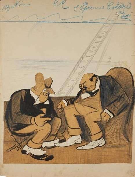 - Roosevelt et Edouard VII. Dessin au lavis sur papier calque, découpé et contrecollé sur papier fort, représentant un entretien entre les deux dirigeants. Non signé, 63 x 48 cm.