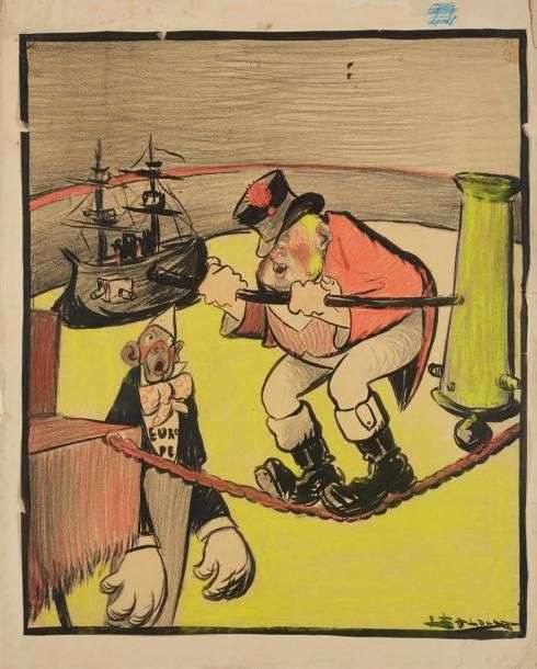 Camara - Tensions Europe-État-Unis. Dessin au lavis avec rehauts de pastel, contrecollé sur papier fort, représentant une scène de cirque symbolisant les relations tendues entre l'Europe et les Etats-Unis. Signé en bas à droite, 58 x 50 cm. Quelques accidents en bordure du dessin et du support.