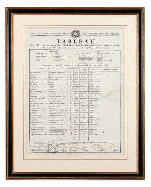 [FRANC-MAÇONNERIE]. Tableau des membres composant la Loge de St-Jean sous le titre distinctif des Amis-Réunis, etc. Vihiers, 24e avril (1806). 1 pp. grand in-folio imprimé, (43 x 56 cm), cachet et signatures en pied| encadrement sous verre, cadre de bois doré (75 x 61 cm)| légère mouillure. Liste nominative des membres suivant l'ordre et l'ancienneté de leur admission, de la Loge de St-Jean, dans la région de Vihiers, Saumur, Brissac...