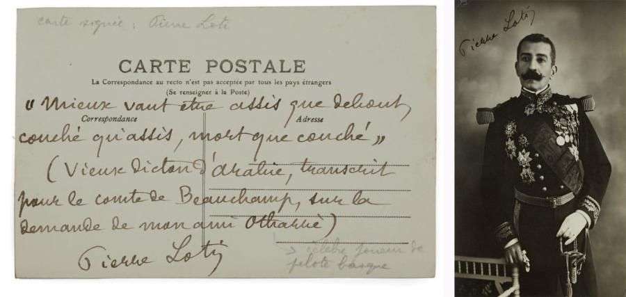 Pierre LOTI. 1850-1923 Officier de Marine, écrivain. C.A.S. «Pierre Loti». S.l.n.d. Carte postale in-12. Carte postale le représentant en uniforme de capitaine de vaisseau, avec 5 lignes autographes: Mieux vaut être assis que debout, couché qu'assis, mort que couché - Vieux dicton d'Arabie (...).