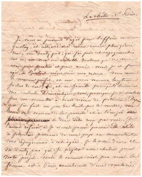 Très belle et longue lettre de Sand, au moment de son procès, sur ses démarches auprès de l'évêque, mentionnant son roman Lélia, fustigeant les préjugés d'une société conservatrice, etc. A propos de son procès en séparation avec Casimir, elle explique combien elle s'est engagé dans une affaire qui lui prendra du temps, et en explique les raisons: (...) Mon neveu le nouveau préfet, et moi, nous sommes longtemps perdus de vus| lui et sa famille parce qu'ils haïssaient ma conduite démocratique| moi, parce que je ne voulais pas me soumettre à leurs théories de patriciens (...). Je ne suis donc pas étonnée qu'il ne m'ait pas donné encore signe de vie, et après tout, dans la position où je suis, plaidant en séparation, n'ayant pas encore mon domicile légal chez moi, je ne puis l'engager à me venir voir (...) J'ai la vanité de croire que ses anciennes préventions sur mon caractère hautain et indépendant, seront bientôt détruites. Alors j'espère qu'il sera très obligeant et que je pourrai à coup sûr réclamer son zèle (...). Elle lui demande de la laisser faire seule| Vous savez comme on interprète toutes choses en ce bas monde. Laissez-moi agir (...). Mon procès sera jugé devant l'opinion aussitôt qu'il sera devant les tribunaux (...). Si je perds mon château, vous verrez que je perdrai bien des sourires et bien des révérences. Si je le gagne au contraire, je serai blanche comme neige et je pourrai me réclamer de mes grands-parens. Ainsi est faite la société, il faut lui faire la guerre pour avoir la paix. Il faut la remuer et lui faire signer le traité qui assure notre dignité et notre repos (...). Elle lui prête Lélia, ouvrage qui est devenue rare, et espère lui offrir bientôt la nouvelle édition complète de ses Rêvasseries. (...) Vous savez lire, vous verrez que n