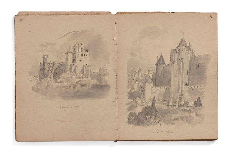 Cahier contenant 43 d’esquisses légendées, représentant des vues de la cité.