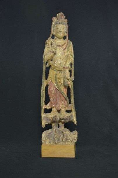 Bodhisattva en bois polychrome à la coiffure fleurie sculpté en haut relief.