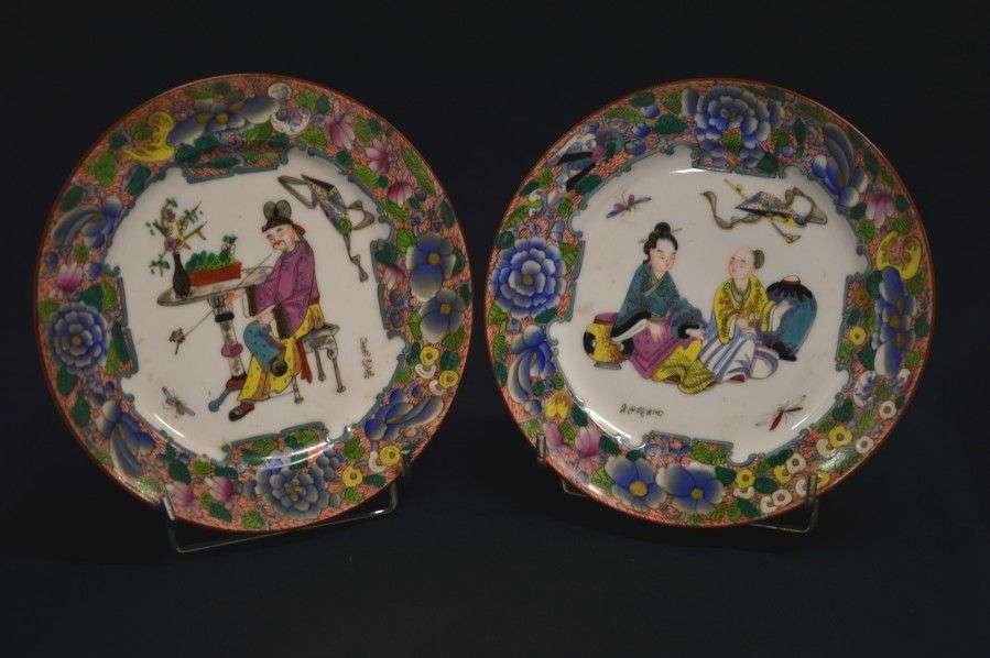 Lot de deux assiettes. L'une représente un homme attablé dans un jardin et l'autre une femme et un enfant assis à l'extérieur également. Marlis fleuris.