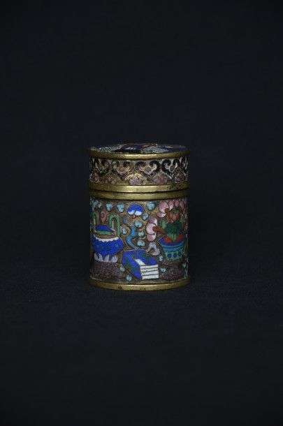 Boîte cylindrique couverte en cloisonné. Décor de vases, pinceaux, cloches, rubans. Bronze cloisoné d'émaux polychromes.
