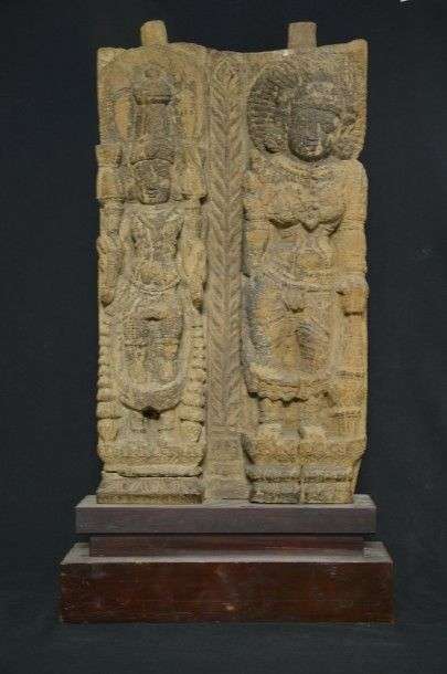Elément d'architecture en bois représentant deux divinités séparées par un pilier sculpté d'une palme.