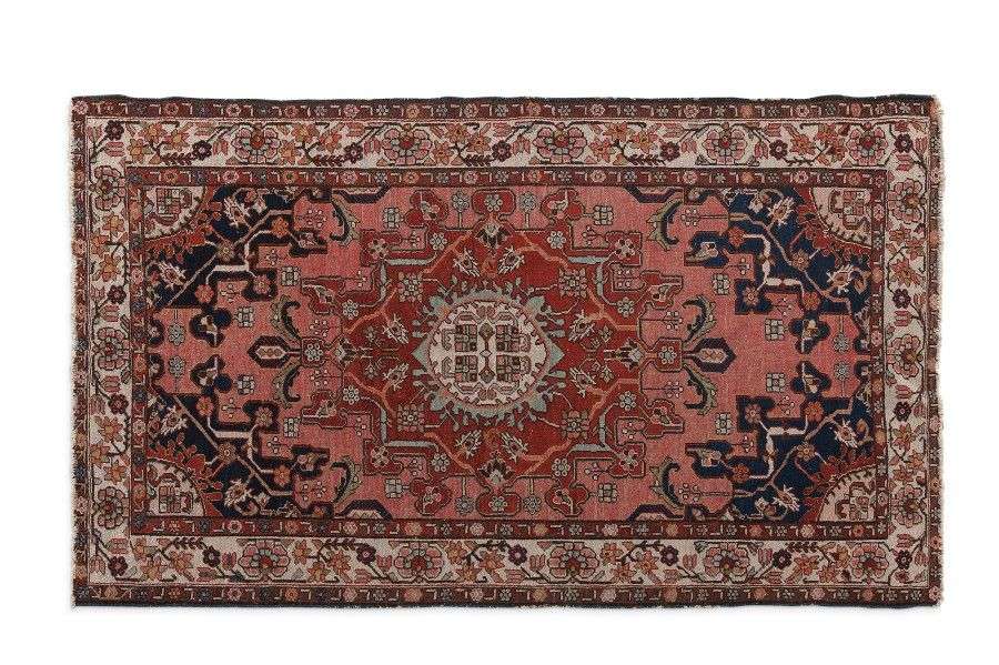 à champ vieux rose à large médaillon central géométrique polychrome. Quatre écoinçons bleu nuit.