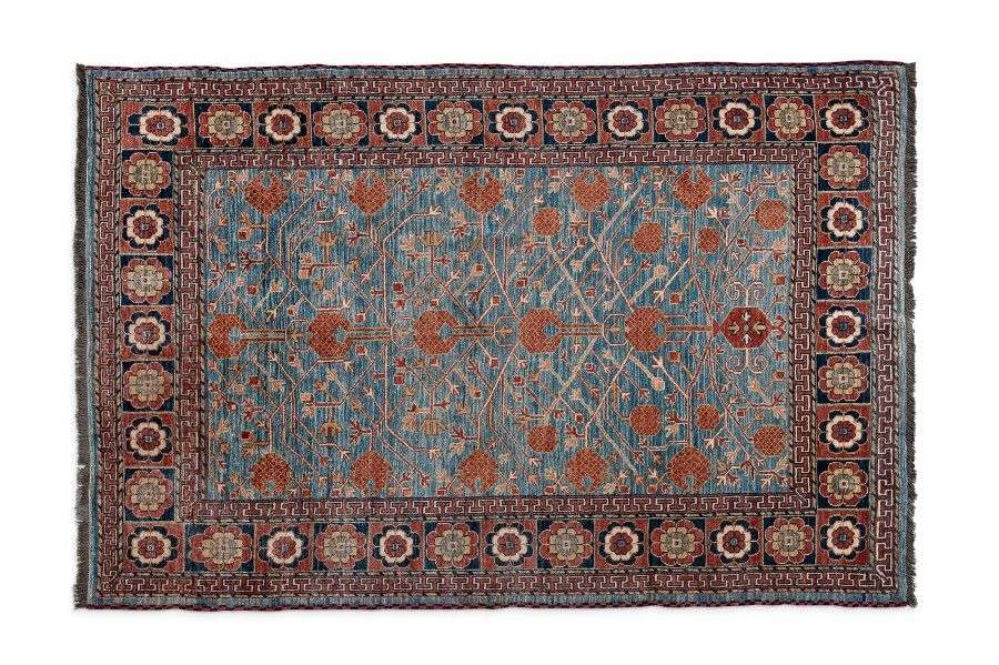 à fond bleu azur et décor de branchages de grenades stylisées