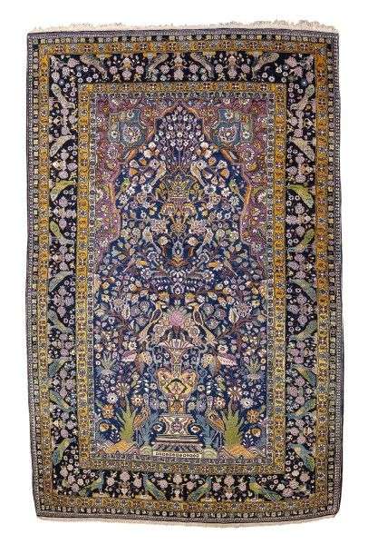 Forme prière à mirghabs sur champ bleu de prusse orné d'un vase richement fleuri et à riche couronne florale
