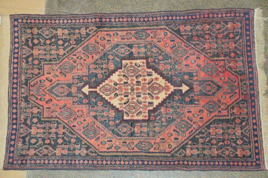 Petit tapisà décor Mina Khani sur fond bleu Prusse, quatre bordures.