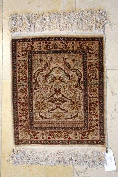 Tapis forme prière en soie sur fond beige doré à palmettes de fleurs