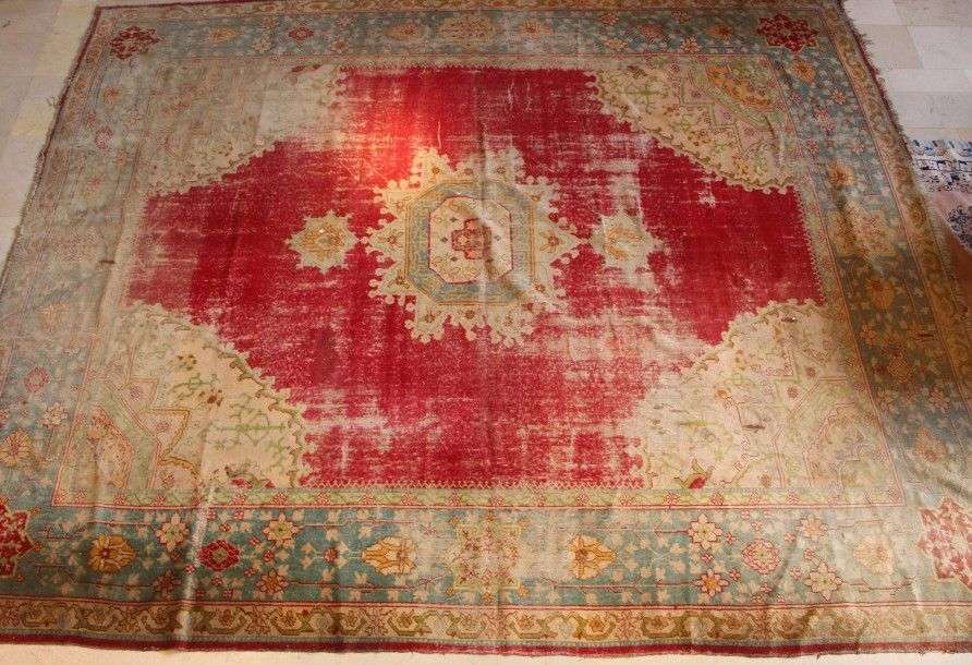 Important tapis rectangulaire à médaillon central sur fond rouge