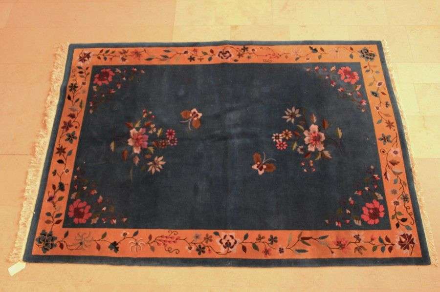 Tapis à fond bleu bordure moutarde et semi de fleurs de lotus