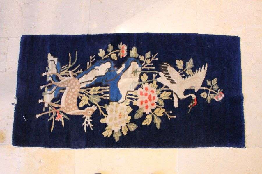 Tapis laine et soie à décor de héron et cervidé sur fond bleu nuit, orné de fleurs de lotus