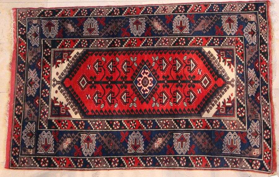 à fond rubis à décor géométrique.