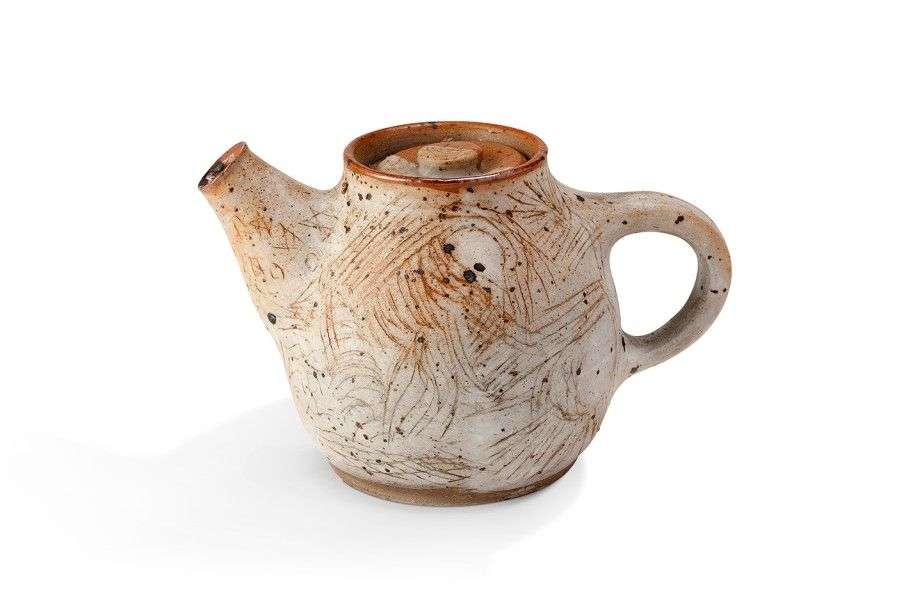 Théière en grès de couleur beige à marron clair, très légèrement pyritée, à décor incisé abstrait
