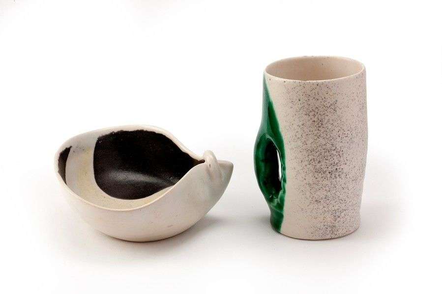 Chope grisée à anse émaillée verte et petite coupelle vide-poche à décor noir intérieur