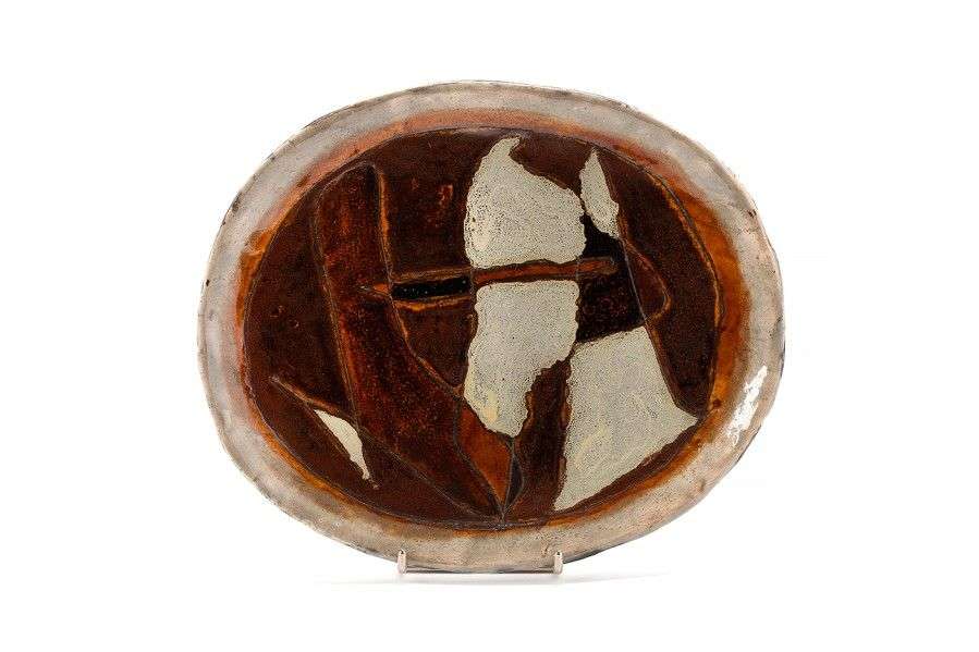 Grande assiette plate ovale à décor abstrait blanc laiteux sur fond marron
