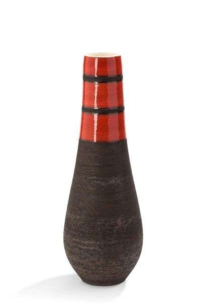 Vase noir de forme pansue à décor de bandes rouges au col en pourtour, émail intérieur blanc