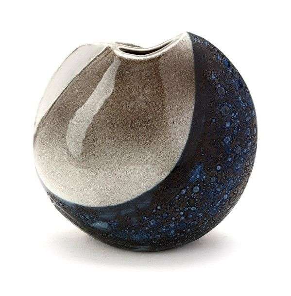 Vase demi lune, émail blanc gris et bleu nuit, présence de cratères sur le bleu, col à double entrée