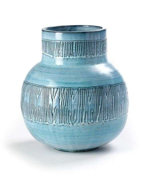 Vase pansu à col droit, émail bleu ciel et rose, décor scarifié